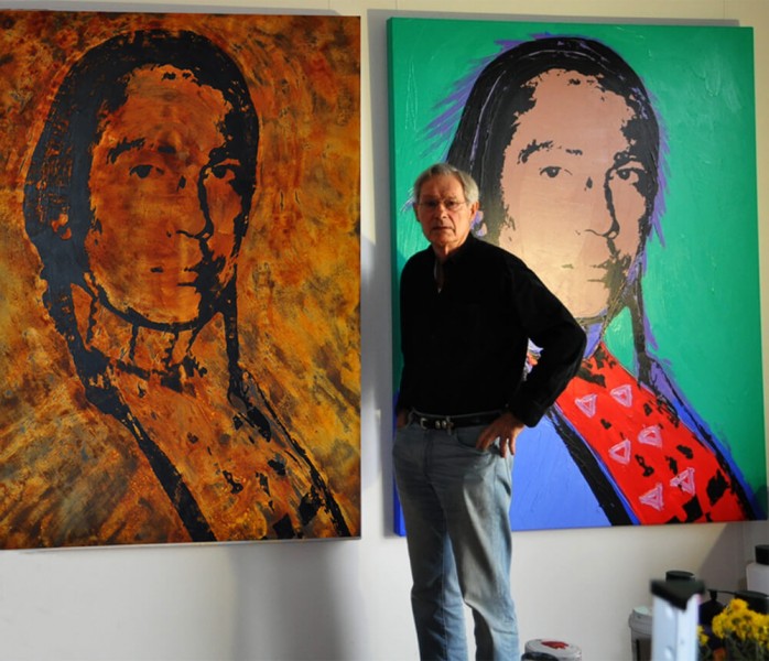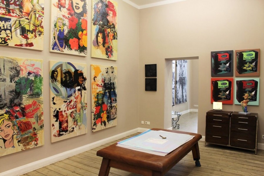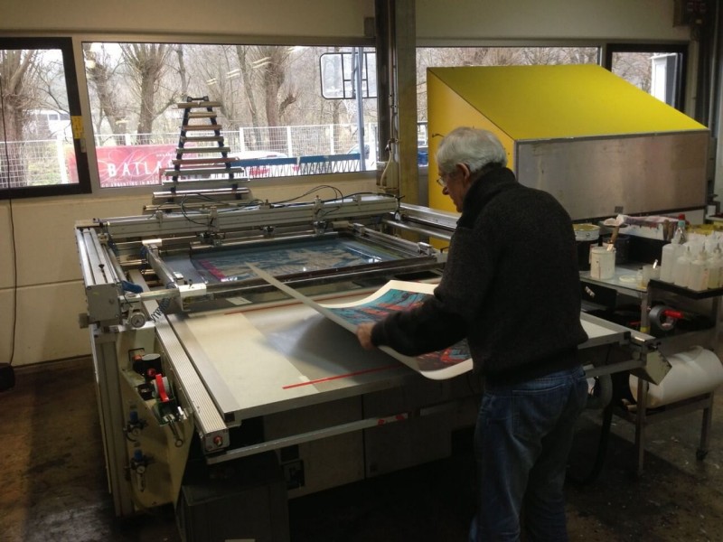 Neben dem Siebdruck verwende ich seit einigen Jahren verstärkt den Digitaldruck. Dabei wird das „eigentliche Bild“ digitalisiert oder direkt im Computer erzeugt. Der Vorteil liegt darin, dass Einzelbilder oder Kleinstauflagen individuell auf hochwertigem Material, wie Leinwand oder anderen, unterschiedlichen Papiersorten gedruckt werden können. Bei meinen neuen Arbeiten verwende ich ein Dia, befeuchte es mit einem Schwamm oder Pinsel und transferiere das Motiv mit einem Rakel auf Papier. Durch diese Technik entstehen die Wasserspuren auf dem Motiv. Das neu entstandene Bild wird gescannt, eventuell gerastert oder umgefärbt. Am Computer setze ich dann die gewünschten Einzelbilder zusammen. Nach dem Druck auf Leinwand übermale ich das ganze Bild.